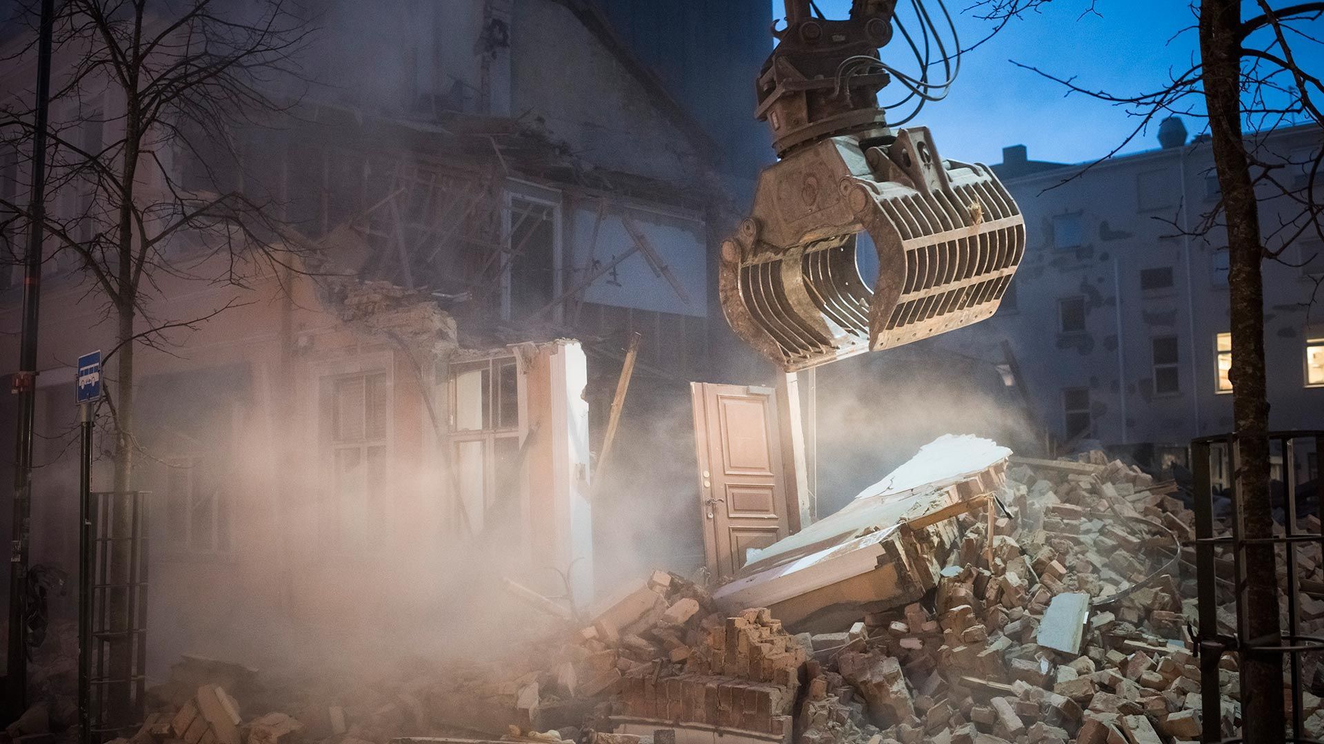 Etter at Kvartal 32 var strippet og kildesortert, stod konstruksjonene nakne igjen. Mursteiner ble ved hjelp av rivningsklo plukket ned fra mursteinsbygningene og fraktet på lasteplan til deponi. Betongbygg er litt mer standhaftige. Så i Kvartal 32 måtte vi bruke en langarmet gravemaskin med påmontert tyggekjeft, som knuste betongen i mindre biter. Vi sorterte så ut armeringsjern for metall og betong og leverte dem som forskjellig typer avfall, forklarer Ager-Wick. Til slutt ble nesten fire tonn med betong, tegn, Leca og andre tunge bygningsmaterialer kjørt vekk fra byggeplassen. Til sammen hadde de da levert 4 855 tonn med ordinært avfall og nesten 8 tonn med farlig avfall. I tillegg hadde Skanska sortert og deponert omkring 100 lastebillass med avfall fra bygge- og riveprosessen, samt 500 tonn forurensede sandmasser.